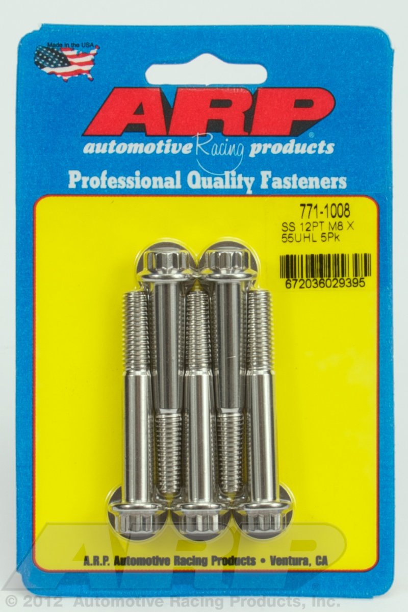 Upgrade your vehicle with ARP 771-1008 M8 x 1.25 x 55 12pt stainless steel bolts. These premium quality bolts are made from ARP 300 stainless steel, offering a tensile strength of 180,000 psi for enhanced safety and durability. Perfect for automotive installations, boats, or trailers. MPN: 771-1008