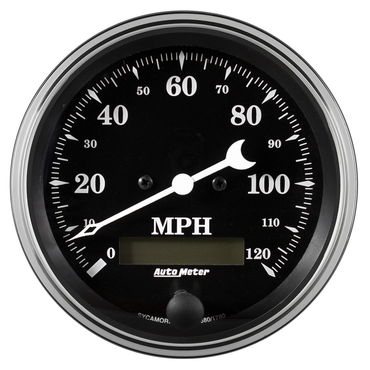 The AUTO METER 1780 Gauge Speedometer in Old TYME Black is a high-quality electronic programmable speedometer with a 3 3/8 inch diameter and a maximum speed of 120Mph. It features an LCD odometer for accurate mileage tracking. MPN: 1780.
