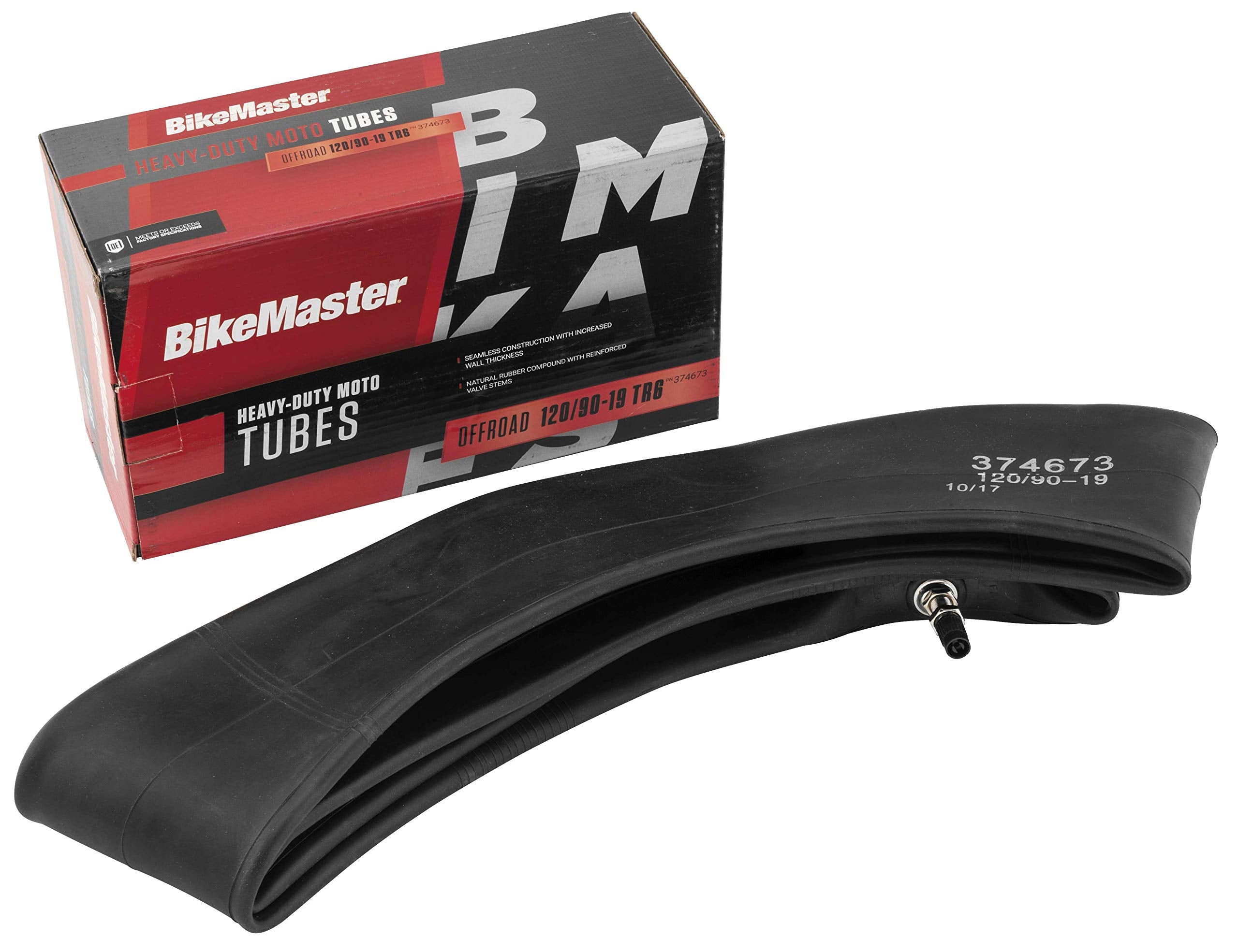 The BikeMaster Heavy Duty Motorcycle Tire Tube in size 120/90-19 TR6 is a reliable inner tube designed for heavy-duty use. It ensures a secure fit and helps maintain optimal tire pressure for a smooth and safe ride. MPN: 374673.