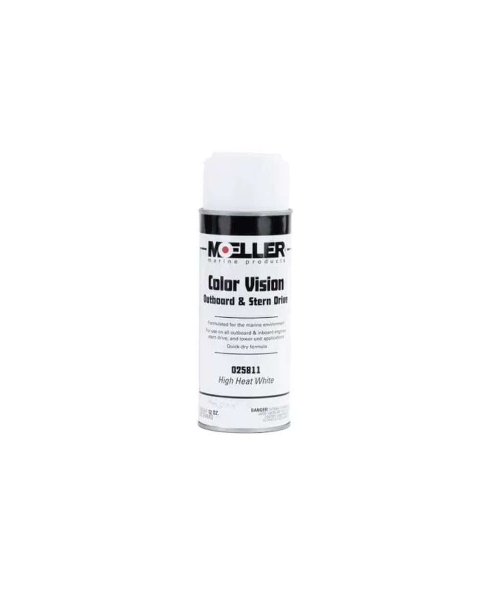 Enhance the look of your engine with Moeller Marine Products Color Vision Paint in High Heat White. This quality-tested paint is formulated for the marine environment, offering color matching to your engine's original color. Approved for use up to 1200 degrees, it's suitable for all outboard and inboard engines, stern drive, and lower unit applications. MPN: 25811.