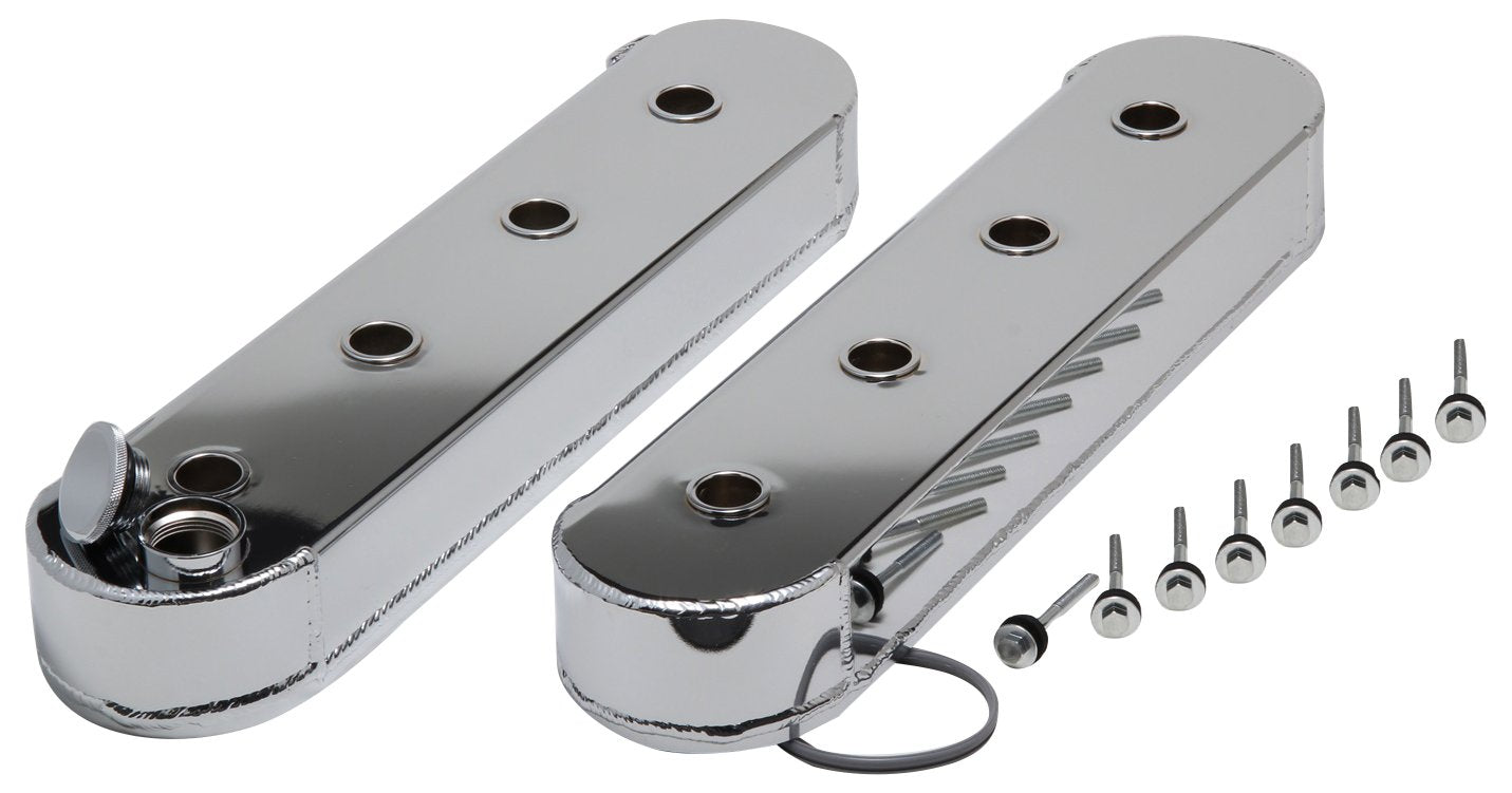 The Hamburgers Performance 1124 Valve Cover is designed for GM LS Series 4.8L/5.3L/6.0L engines. These fabricated aluminum valve covers feature a chrome-plated finish, a height of 2-1/2 inches, and come in a set of 2. They include hardware and an O-ring seal for easy installation. Please note that these valve covers do not have coil bracket mounts, requiring coil packs to be relocated for use. MPN: 1124
