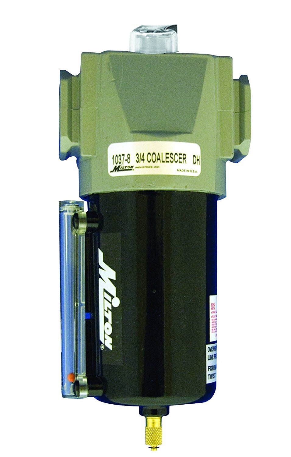 The Milton 1037-8 3/4" NPT Metal FRL Coalescing Filter is designed to efficiently remove oil and water droplets from compressed air systems, ensuring clean and dry air supply. With a 3/4" NPT connection and coalescing filter element, this filter is ideal for industrial applications. MPN: 1037-8.