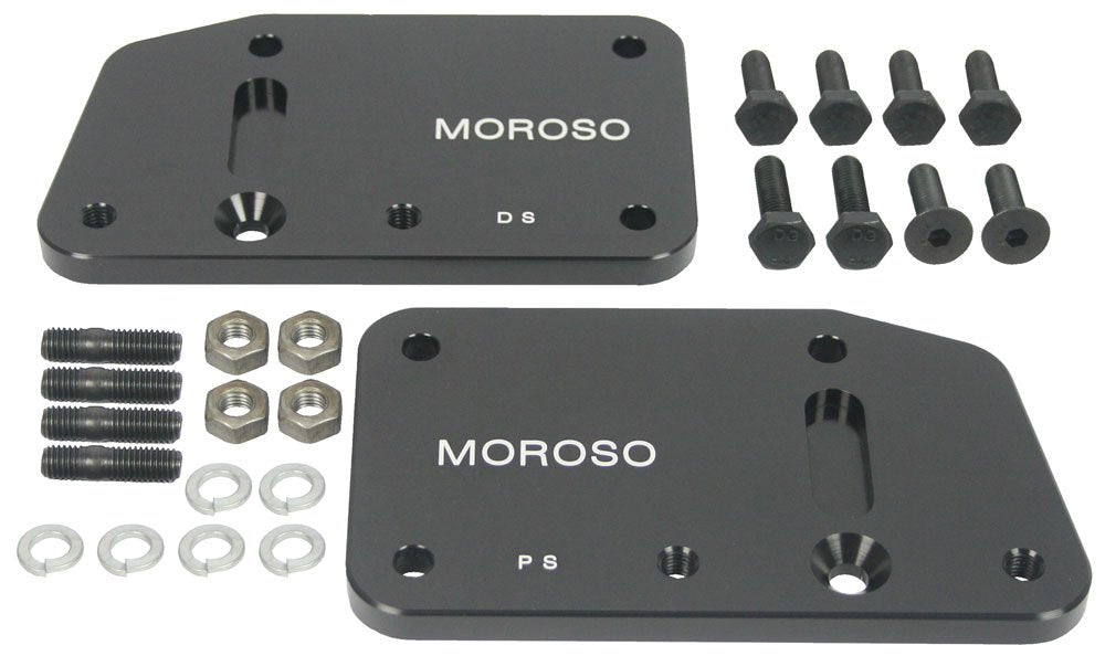 The Moroso 62555 Motor Mount Adapter Plate is designed for Chevrolet LS Series engines, featuring a durable black anodized aluminum finish. This pack includes 2 adapter plates and all necessary hardware for easy installation. MPN: 62555.