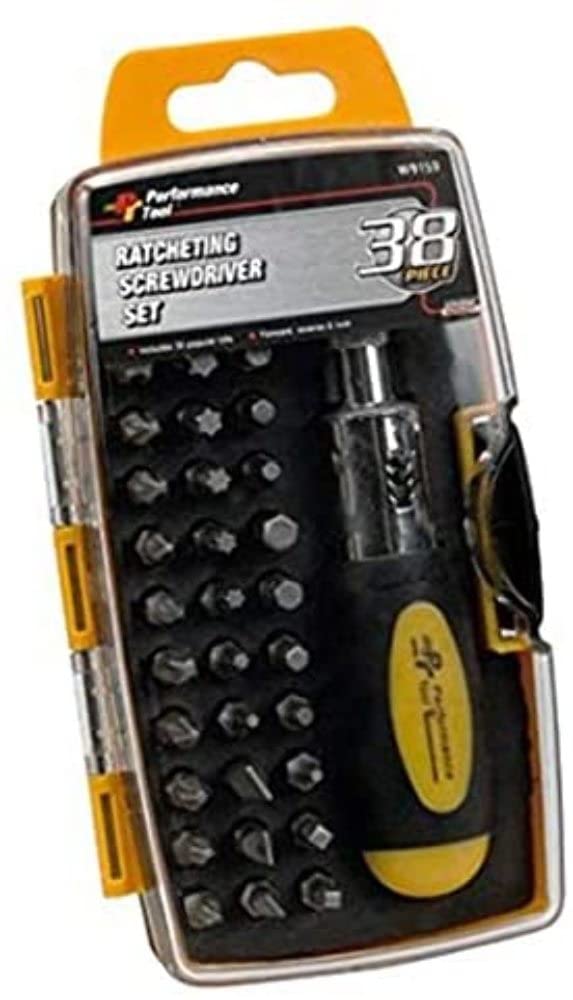 The Performance Tool W9159 38-Piece Ratcheting Screwdriver Set 4-Piece Shipper is a versatile toolset designed for various home improvement tasks. This set includes 38 ratcheting screwdriver bits for different screw types and sizes, providing convenience and efficiency in one compact package. MPN: W9159.