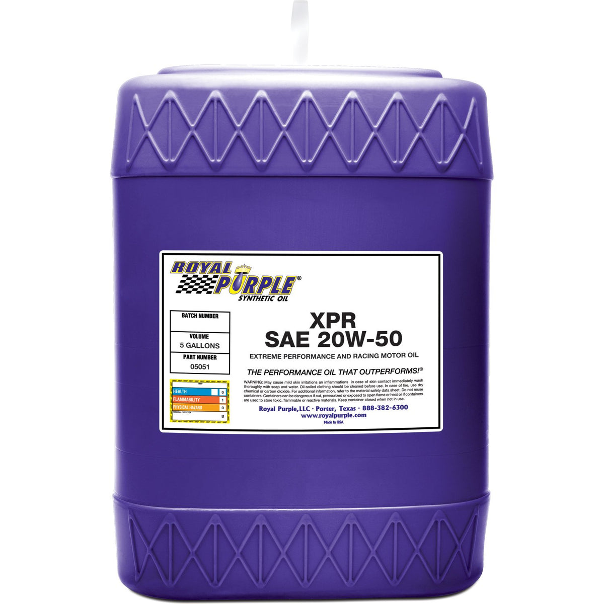 The Royal Purple 05051 XPR 20W-50 Ultra-Light Extreme Performance Synthetic Racing Motor Oil in a 5-gallon container is designed for high-performance engines, offering exceptional protection and performance under extreme conditions. MPN: 5051.