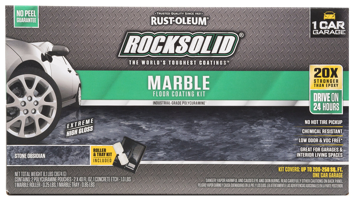 The Rust-Oleum 306320 RockSolid Marble 1 Car Garage Floor Coating Kit in Stone Obsidian Gray/Black is a 5-piece set designed to transform your garage floor with a durable, marble-like finish. This kit includes everything you need to achieve a professional-looking result. MPN: 306320.