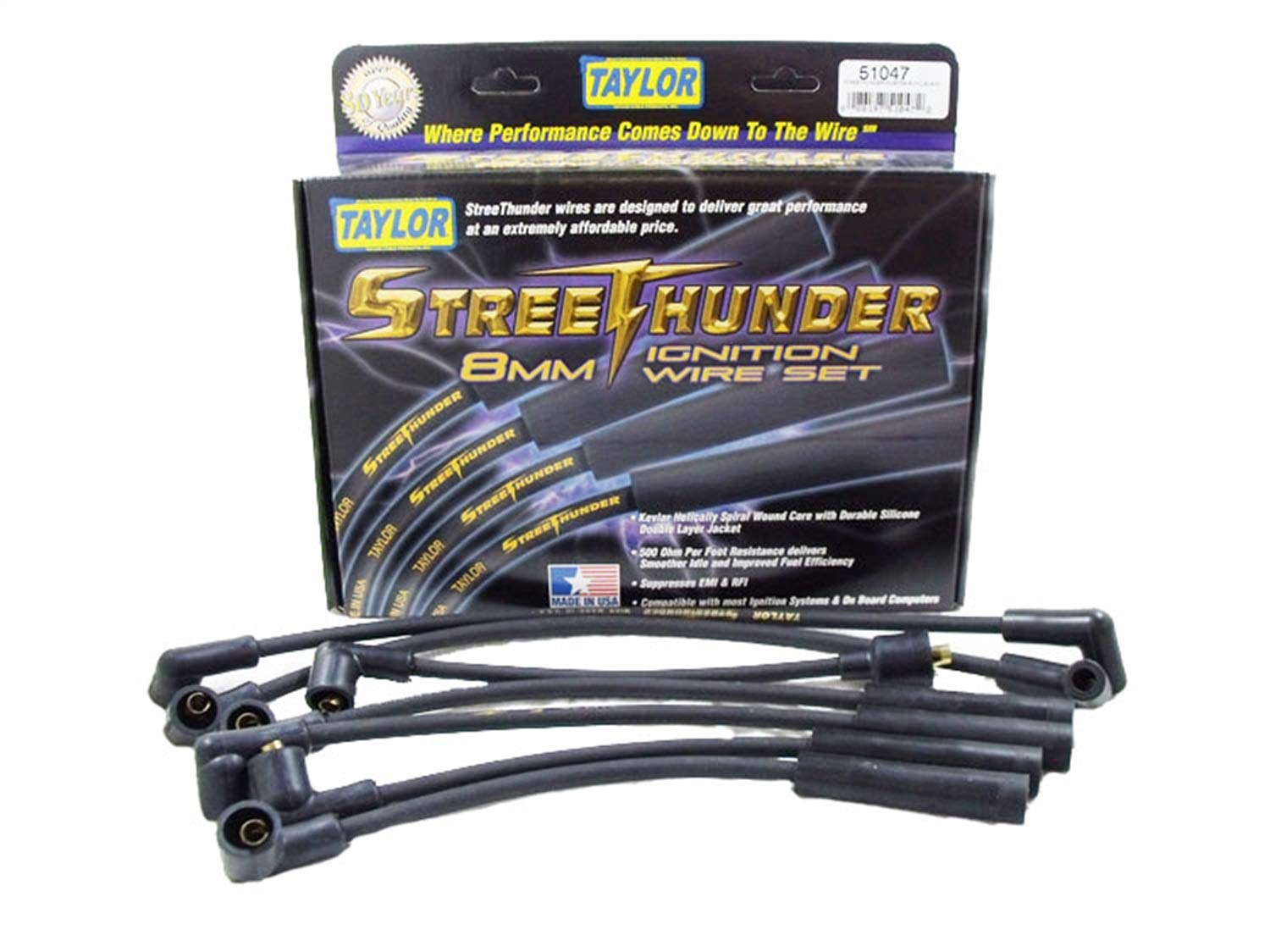The Taylor Cable 51047 Streethunder custom wire set is designed for 6-cylinder vehicles, providing reliable ignition performance. The wires are coated in black for a sleek look and come with the MPN 51047 for easy identification.