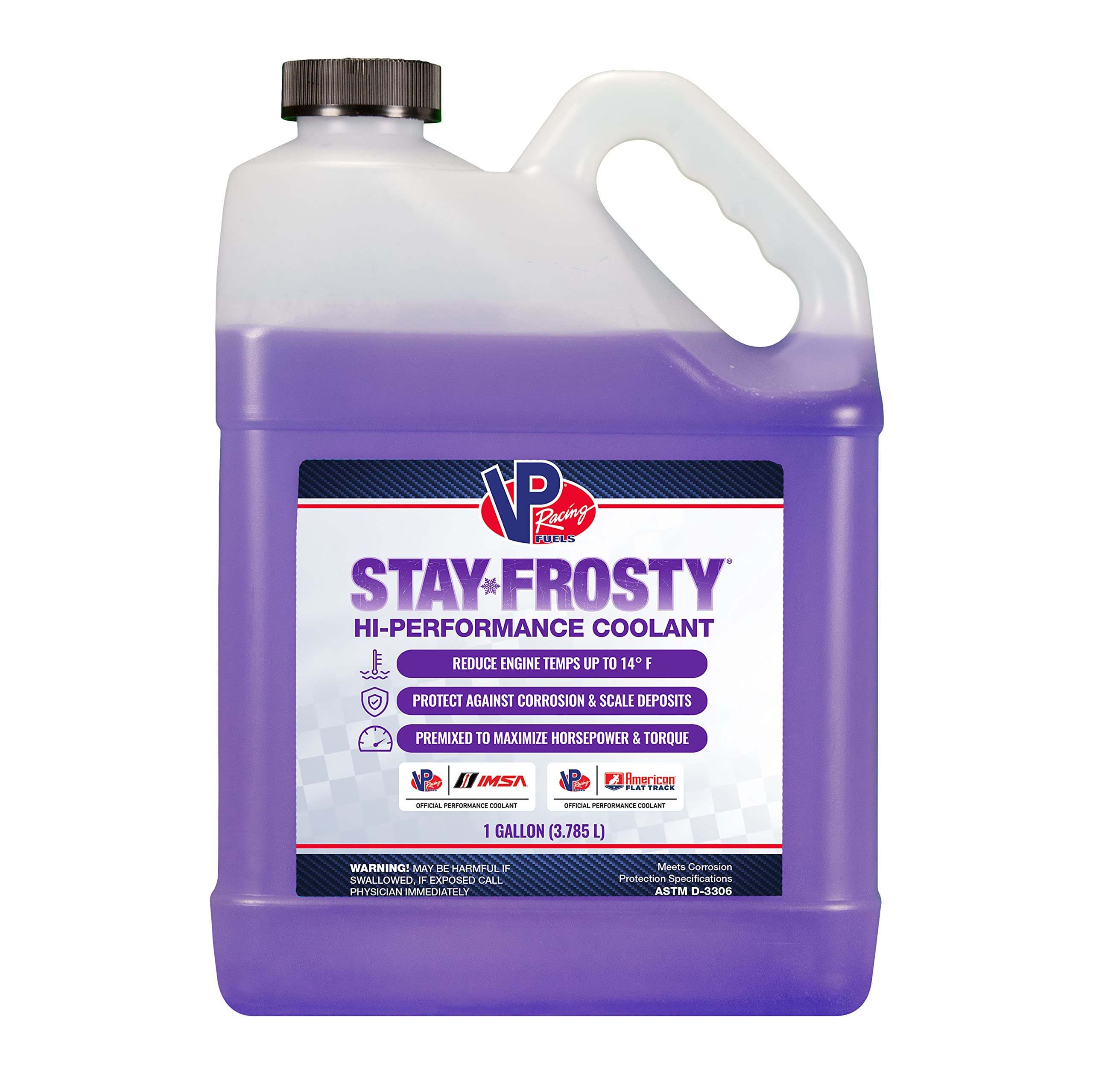 Stay Frosty Hi-Performance engine coolant by VP Racing is a premixed, ready-to-use coolant designed for high-performance engines. Formulated with a blend of heat transfer agents and propylene glycol, it effectively dissipates heat from cylinder heads, reducing operating temperatures and providing protection against overheating. MPN: 23071
